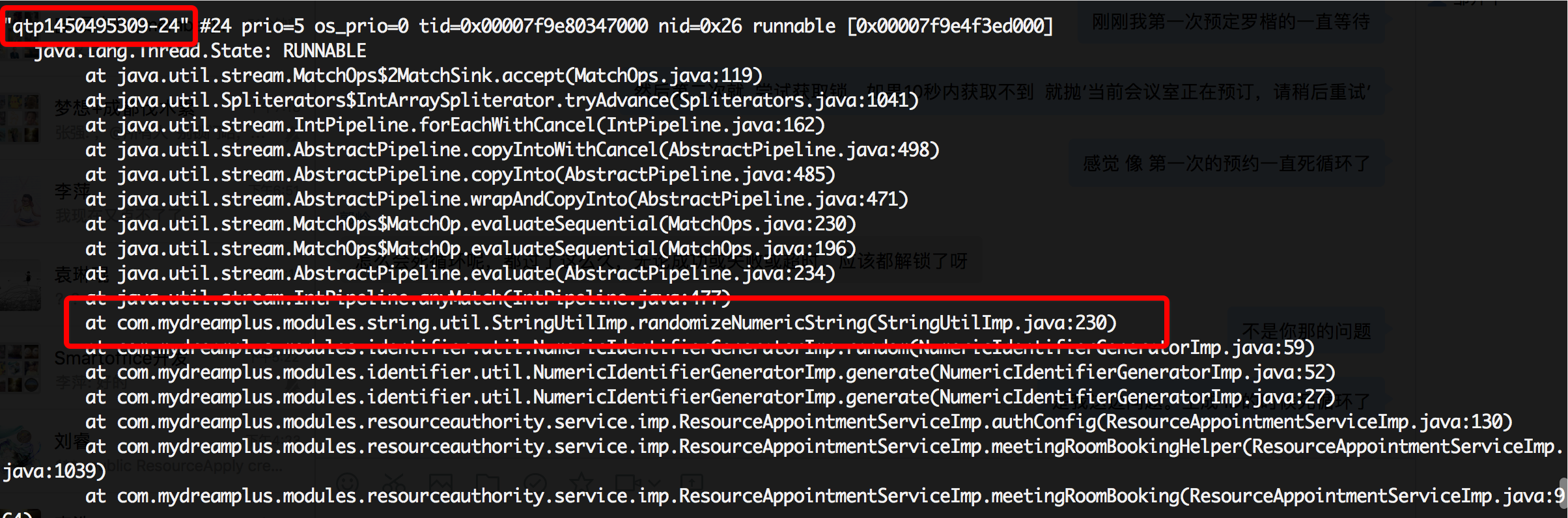 随后通过jstack查看,发现有处执行栈很可疑。即生成业务ID的部分代码部分。因为通常生成ID很快,jstack不太可能正好捕获到该执行栈,然而每次jstack都能捕获到该执行栈。又因为CPU负载异常,所以判断是生成ID的模块有死循环BUG。